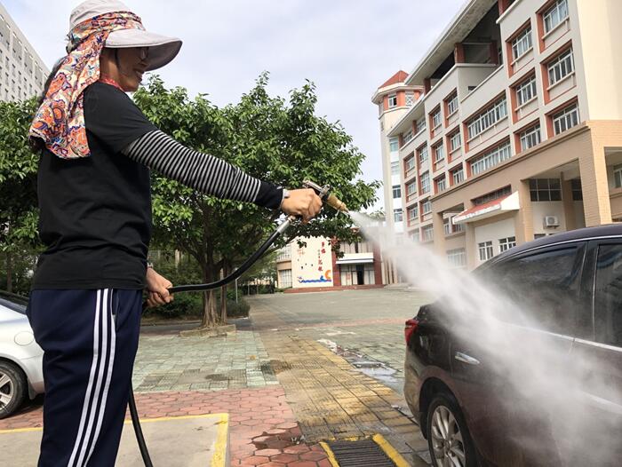 女党员同志顶着烈日为学生示范高压水枪的使用