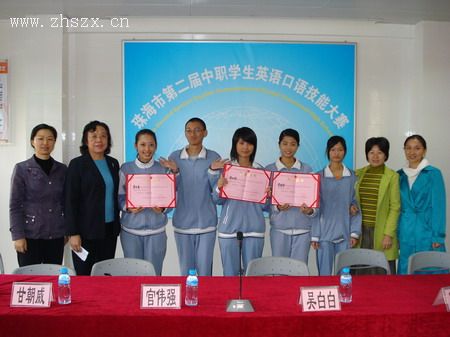 在教育局的大力支持下,由市职教协会、职业院校工作指导委员会主办的珠海市第二届中职英语口语技能大赛,于二00八年十二月二十五日在市一职校顺利举行,参赛的三十名选手来自珠海市六所中职学校,亲临比赛现场指导的有教育局领导吴白白副调研员、职成科科长职教协会副会长石玉屏、职教协会会长官伟强、职教协会副会长詹红红。经过激烈的角逐,比赛决出了胜负,我校06高职2班章欣茜同学荣获二等奖,08计2班梁椅恩、08高职班潘秋燕同学荣获三等奖.对以上获奖的同学表示祝贺,对参加辅导、为此次竞赛付出辛勤劳动蒋雅梦、欧阳清、牛薇妮老师表示感谢。