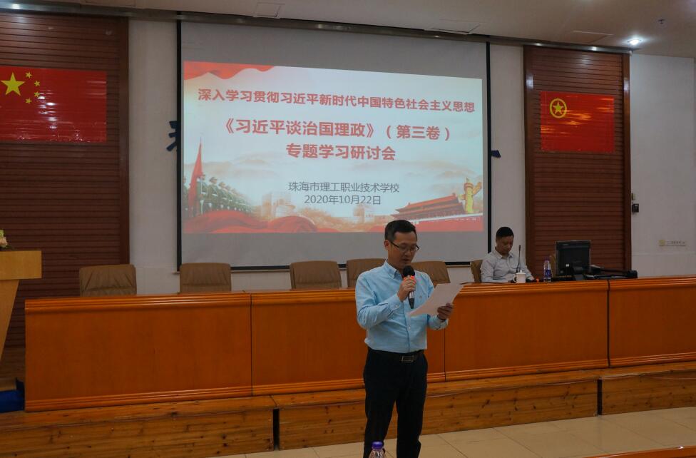为深入学习领会《习近平谈治国理政》第三卷的核心要义、精神实质、丰富内涵和实践要求,进一步增强“四个意识”、坚定“四个自信”、做到“两个维护”。按照市委宣传部、市委教育工委关于开展《习近平谈治国理政》第三卷宣讲工作的通知以及我校纪律教育学习月活动安排,10月22日、10月23下午,分两校区举行了《习近平谈治国理政》第三卷宣讲活动,全体教职工聆听珠海市委宣传部宣讲团成员、吉林大学珠海学院马克思主义学院副院长、党总支书记周耕宣讲《习近平谈治国理政》第三卷。会议由黄武略副校长、刘春龙副校长主持。