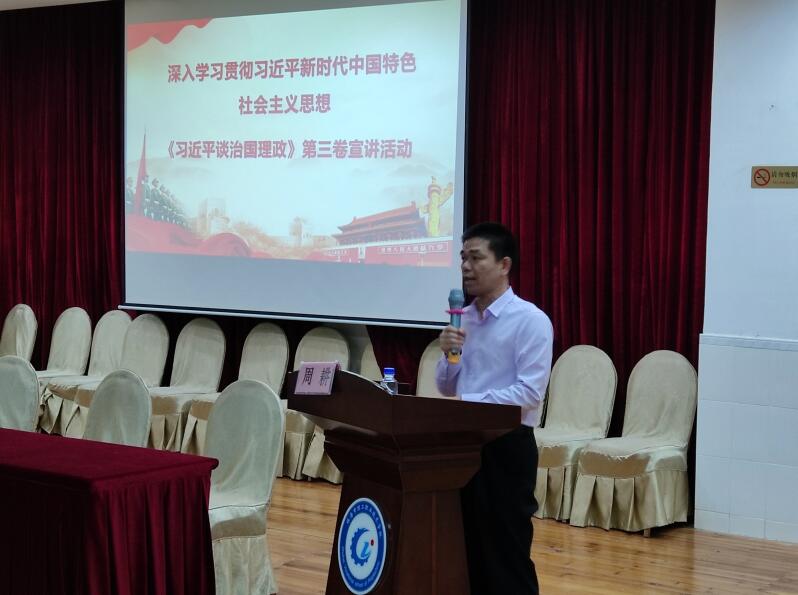 周耕副教授的宣讲主题是《以人民为中心的新时代蓝图谋划——<习近平谈治国理政 第三卷>精神解读》,宣讲的内容包括:“第三卷”的出版情况及内容概要、谱写新时代中国特色社会主义新篇章、以人民为中心的情怀、应对新形势的伟大事业新部署、心系天下的胸怀等。
