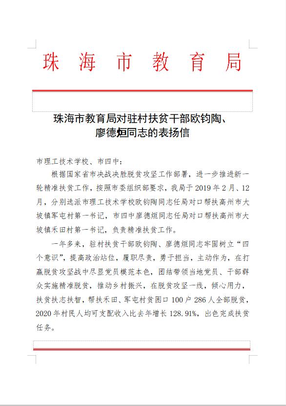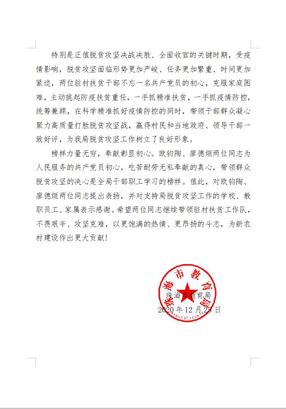 珠海市教育局为此特意给学校写来表扬信,对欧钧陶老师提出表扬,并对我校支持局脱贫攻坚工作及教职员工、家属表示感谢,希望扶贫干部继续带领驻村扶贫工作队,不畏艰辛,攻坚克难,以更饱满的热情、更昂扬的斗志,为新农村建设作出更大的贡献!