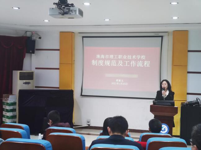 首先,办公室梁紫玉主任做了题为《珠海市理工职业技术学校制度规范及工作流程》的培训,对学校主要管理制度、行文用语规范、工作流程等进行详细解说。梁主任的解说,旨在让学校干部了解学校制度和工作流程,促进部门之间互相沟通与交流,提高工作效率与规范工作流程。