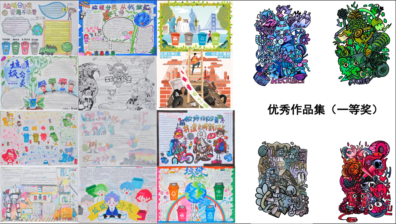 本次活动得到各班的积极响应,上交了两百多份作品。参赛的同学广泛收集垃圾分类相关的资料,用绚丽的色彩、独特的构思、真诚的文字勾勒出一幅幅主题鲜明的作品。