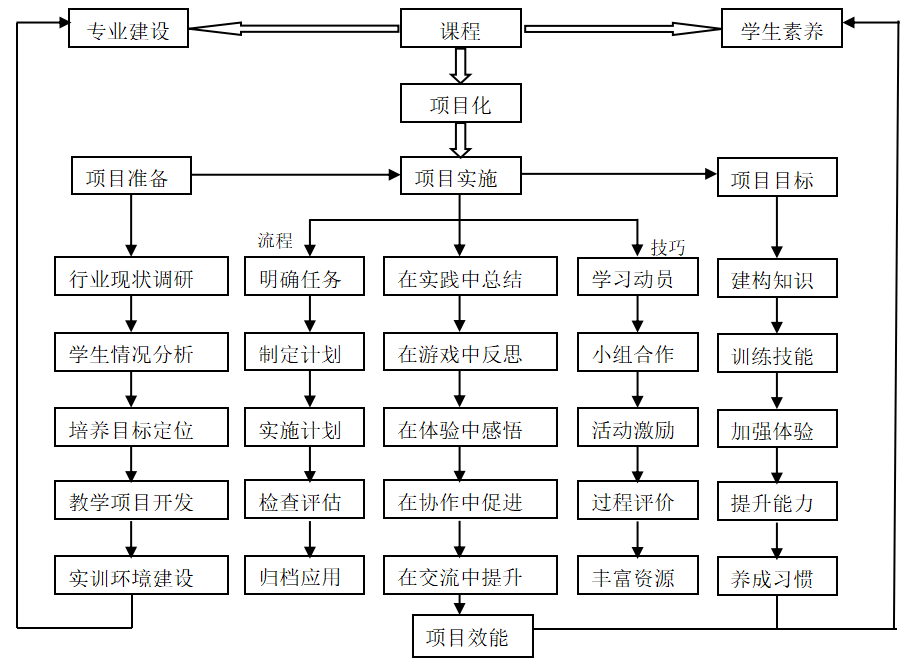 研究项目推进的逻辑思路与关键要点,构建了矩阵式的实施路线图。在物流教学项目化改革中,创新性地搭建了项目准备、项目实施(含流程、技巧、效能)、项目目标的“五纵”推进路线,每一路线分别设置了“五横”关键点和任务点。这一实施路径目标明确、逻辑严密、指令清晰、灵活机动,便于理解与推广,在学校精品课程建设、云课堂协同的混合教学模式、课程教学诊改等项目中持续得以延伸应用、升级推广。