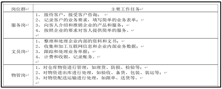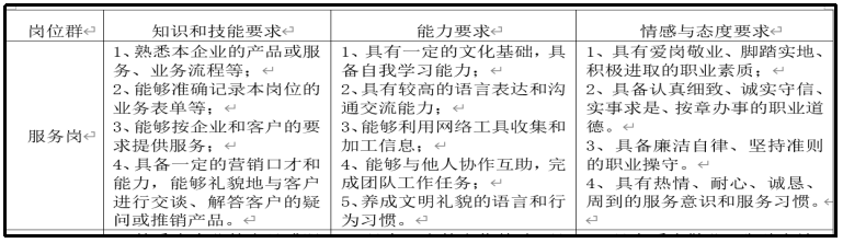 依托市“产学研”工作室和物流行业协会会员单位,课堂组对环众物流咨询公司等知名企业进行实地走访,了解企业对学生的素质要求,对我校物流毕业生的就业去向进行了统计,根据主要就业岗位群的工作特性进行分类整理,制定了服务岗、文员岗、物管岗的主要工作任务(图2)和任职要求清单(图3)。在教学项目的目标确定和内容编排上,充分吸收上述岗位类型任职要求,同时参照“物流员”等相关职业等级资格的要求,研究教学项目的目标任务、教学要点、学时安排、教学方法等,以工作过程系统化的思路开发课程,编写了一系列企业需求、实训环境、学生特点三对接的校本教材共20本。