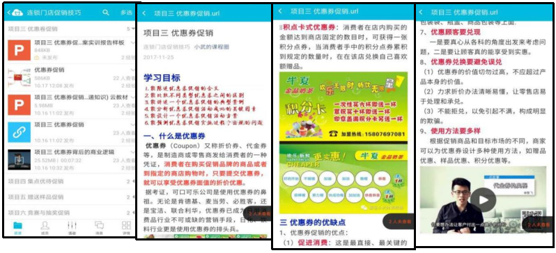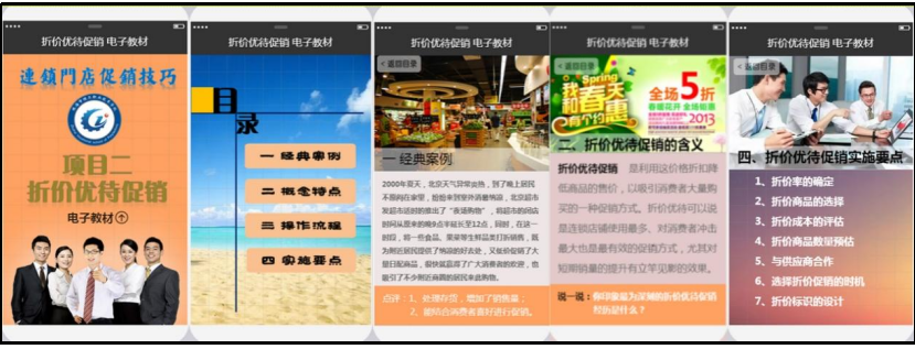 受限于场地和业务资源,物流专业课程的很多场景和流程无法在学校展现,学生没有直观的感受,更难以开展实训练习。为此,各课程组根据课程特征和教学需要,开发了丰富多彩各具特色的教学资源。《连锁门店促销技巧》等课程利用微信订阅号(图4)、H5微场景(图5)将网络上大量与教学内容相关的文章、图片、视频整合在一起制作成学材,链接到云平台资源库,滚动更新推送给学生。《运输作业课程》在云平台上建设了课件资源库、经典案例库、微课资源库、实训项目库、在线试题库、教学反馈资源库、延伸学习资源库等8个教学资源库,