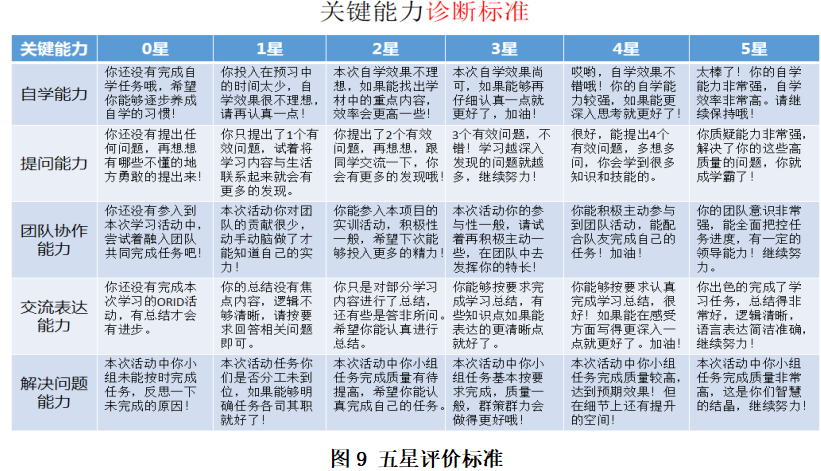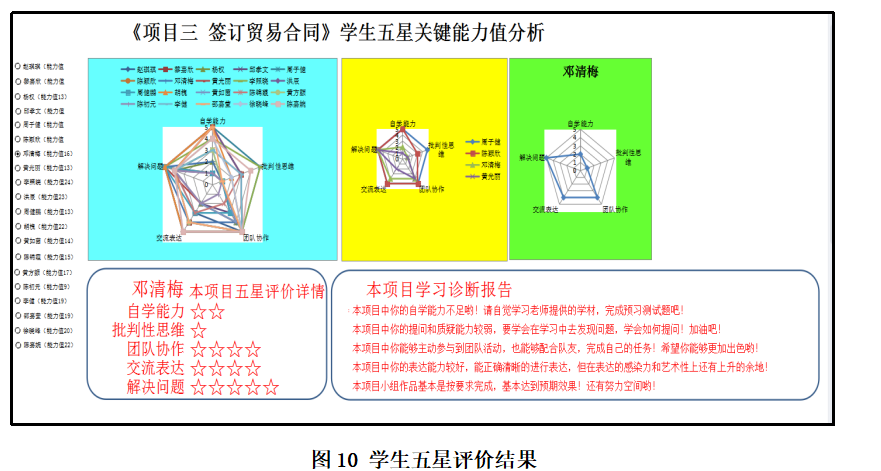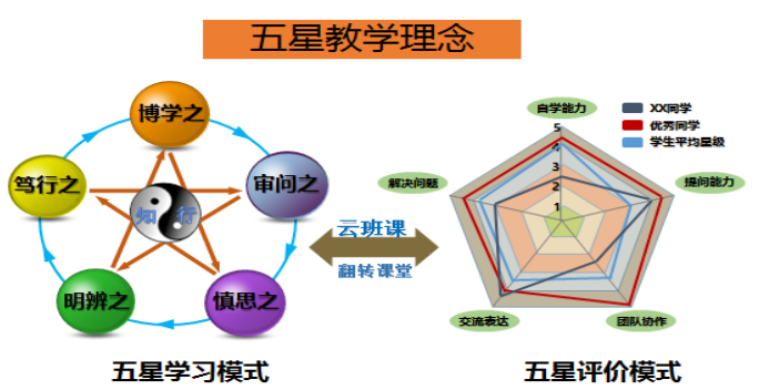 课程团队采集学生在校学习状态和用人企业反馈,研究学生职业生涯发展的能力培养需求,精准定位了自学能力、提问能力、团队协作能力、交流表达能力、解决问题能力为我校物流专业人才培养的五大“关键能力”。以培养五大关键能力为成果导向,多门课程探索了“五星教学理念”(图7)。借助云平台实施翻转课堂,开展“博学之,审问之,慎思之,明辨之,笃行之”的“五星教学实践”(图8),再运用“五星评价标准”(图9)对学生的学习过程和学习结果进行客观、可靠的即时评价(图10)。学生在能力培养过程中自我认识、自我激励,教师的教学也依据评价体系的构建得以有针对性地开展诊断与改进,形成良性循环的教学生态圈。
