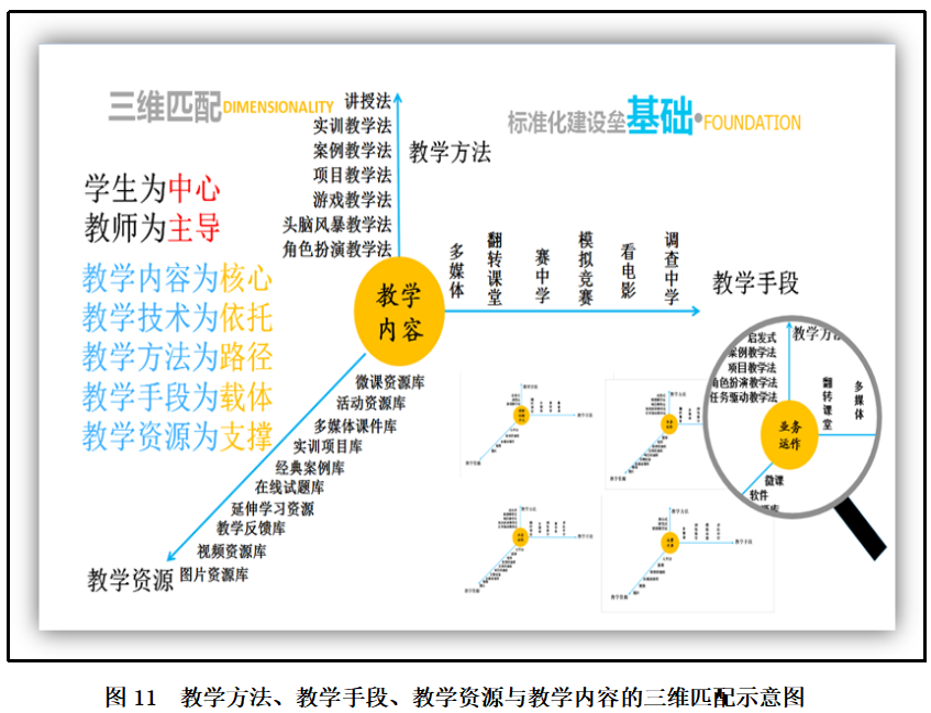 依托信息技术与课程教学的深度融合,开设线上云课堂,引导学生与其他学习者、教师、学习资源、互联网之间进行即时交互、密切联动。《运输作业实务》等课程精细化设计课前-课端-课中-课尾-课后的五段式全过程教学策略:课前-导学单引领的微课自主学习,课端-基于教学数据反馈的重难点突破,课中-多种学习方式结合的实践教学,课尾-结合教学评价开展学习总结,课后-延伸学习与课前预习相结合的递进式学习。为配合精细化的教学策略,该课程建立了三维匹配图(图11),针对不同的教学内容设计匹配的教学方法、教学手段和教学资源。五段式教学模式中,创设了循序渐进、轻松愉悦的学习情境和学习氛围,构建了学习场景、学习素材、学习动机、学习氛围、学习关系等各个关键要素有序运转的教学生态圈(图12)。该课程获广东省中小学校本课程建设成果评展活动一等奖,珠海市教育教学成果二等奖。