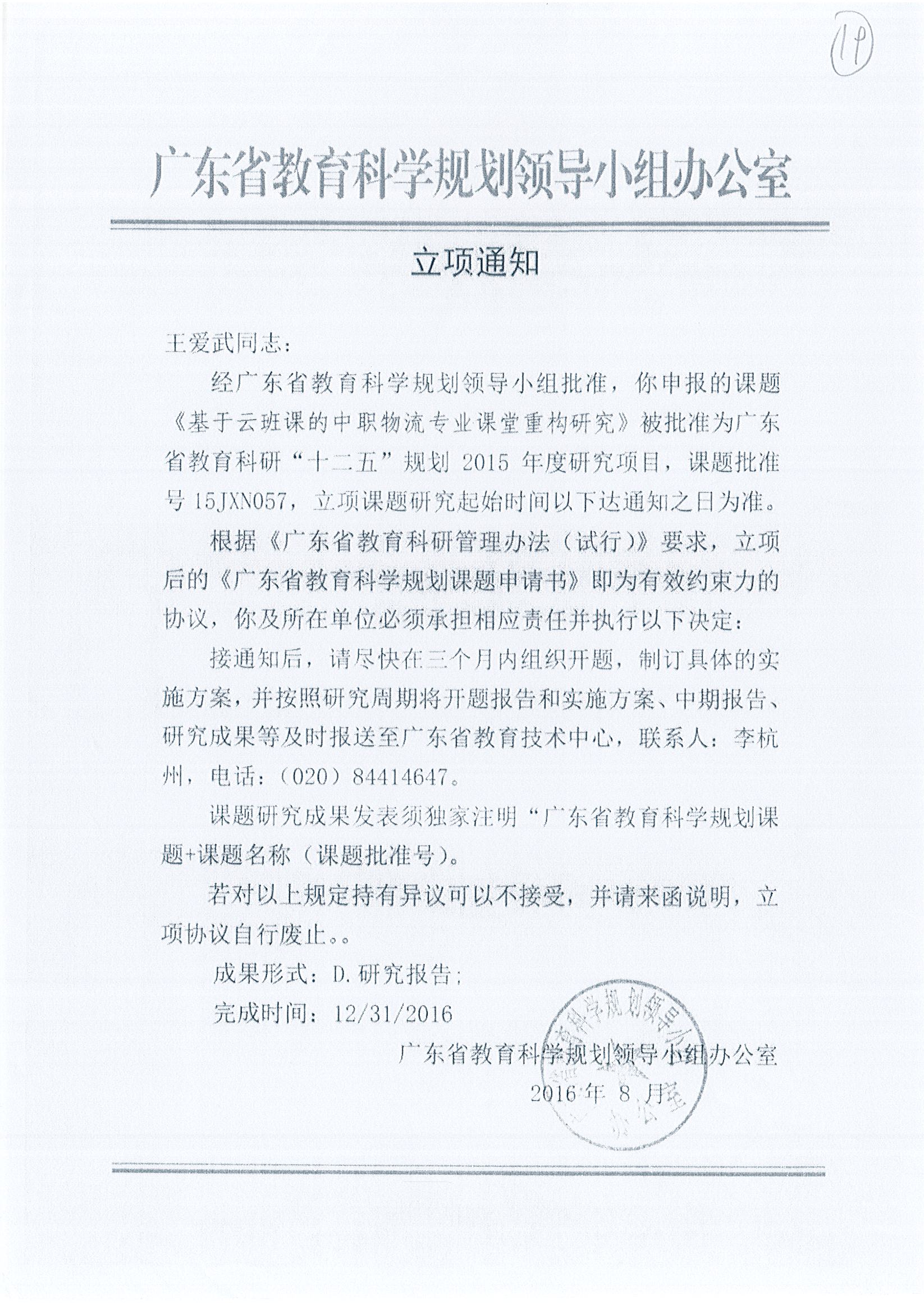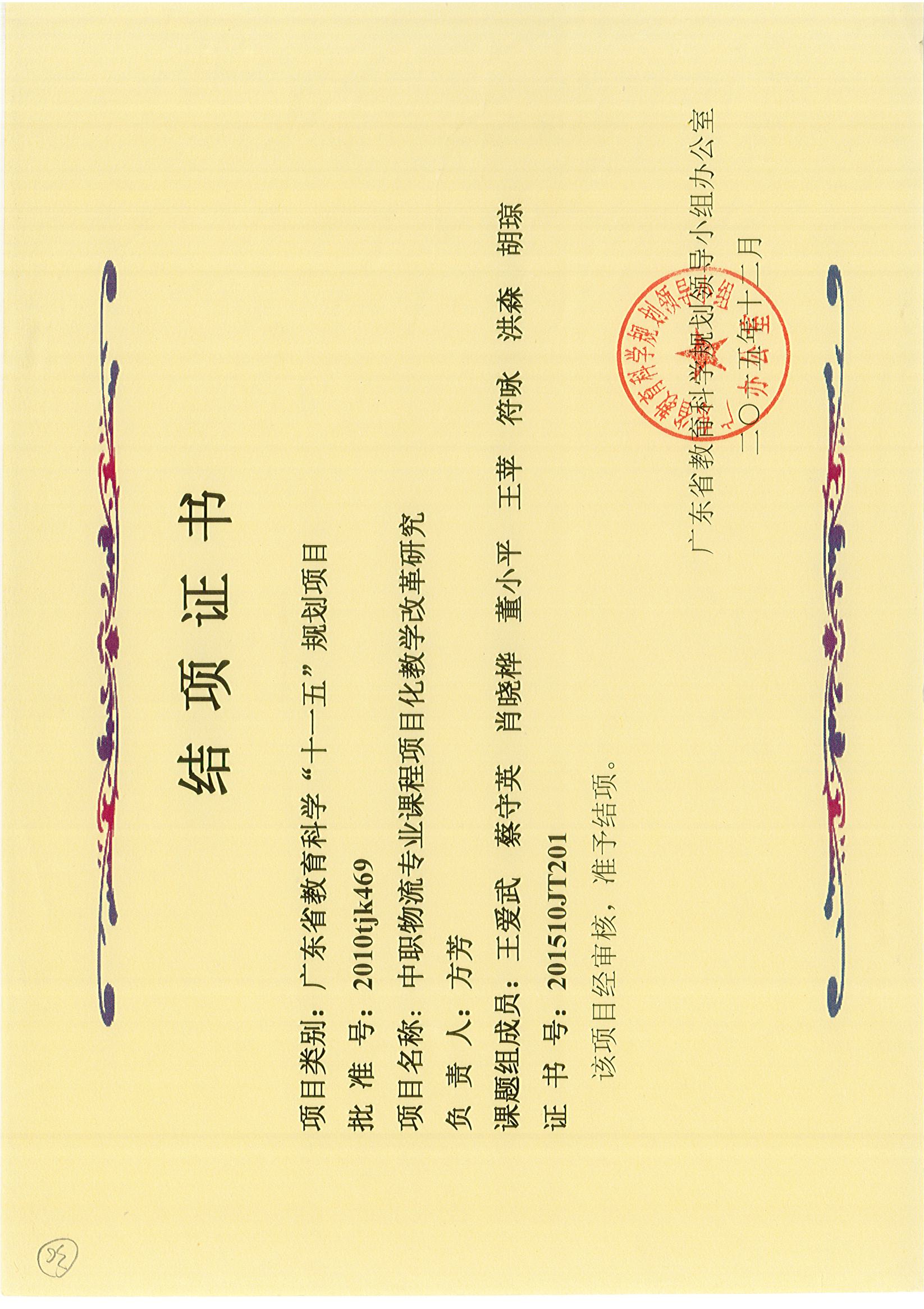 1 | 中职物流专业课程项目化教学改革研究 | 20000 | 已结题 | 广东省教育科学“十一五”规划项目 | 广东省教育科学规划领导小组办公室 |