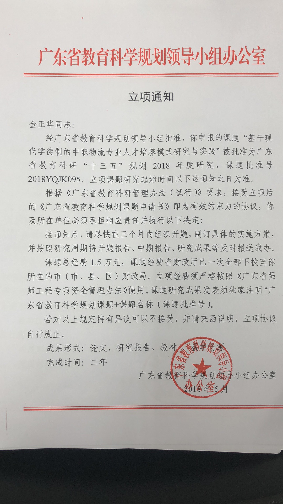 4 | 基于现代学徒制的中职物流专业人才培养模式研究与实践i | 15000 | 已开题 | 广东省教育科研“十三五”规划2018年度研究课题 | 广东省教育科学规划领导小组办公室 |