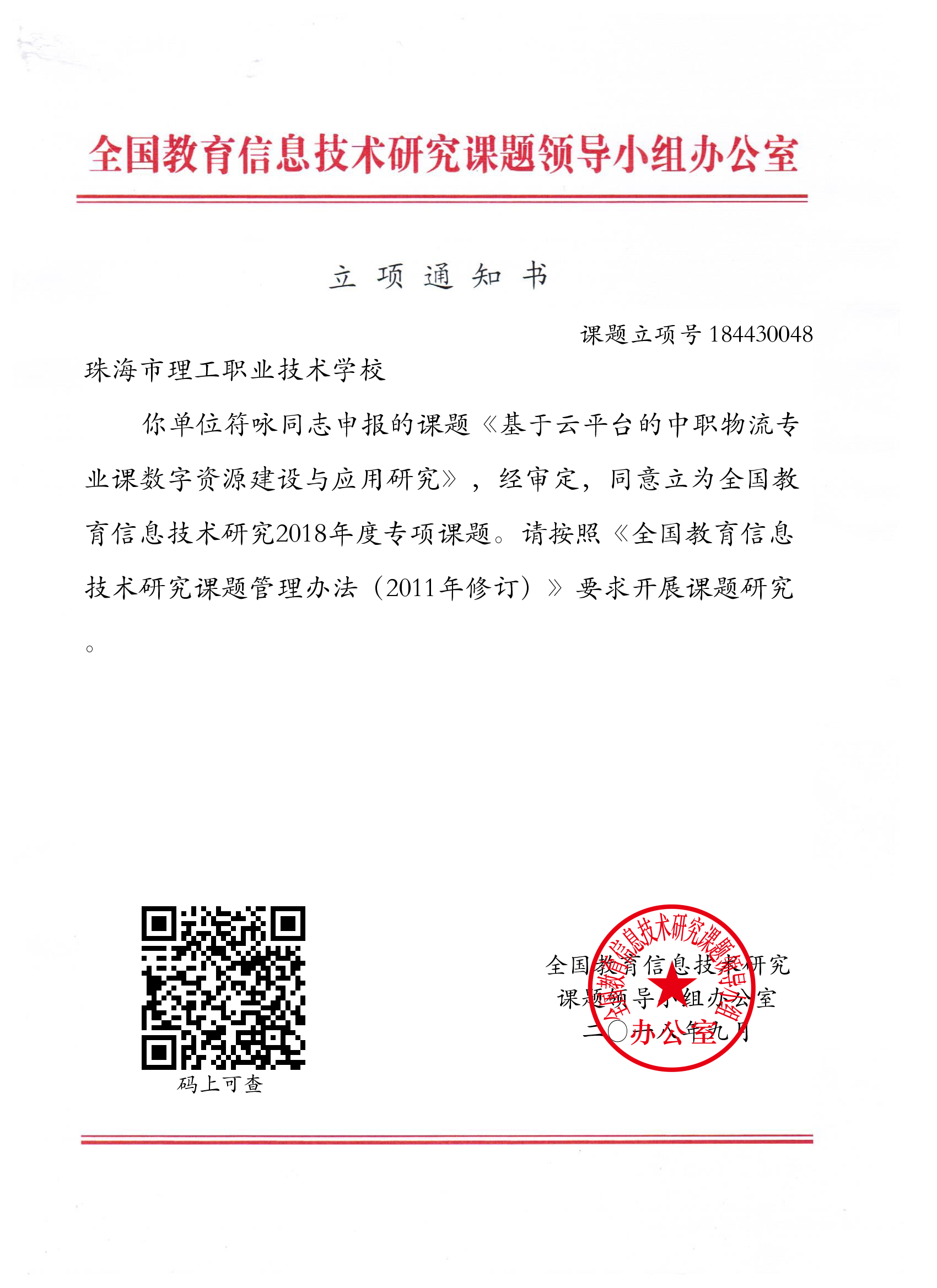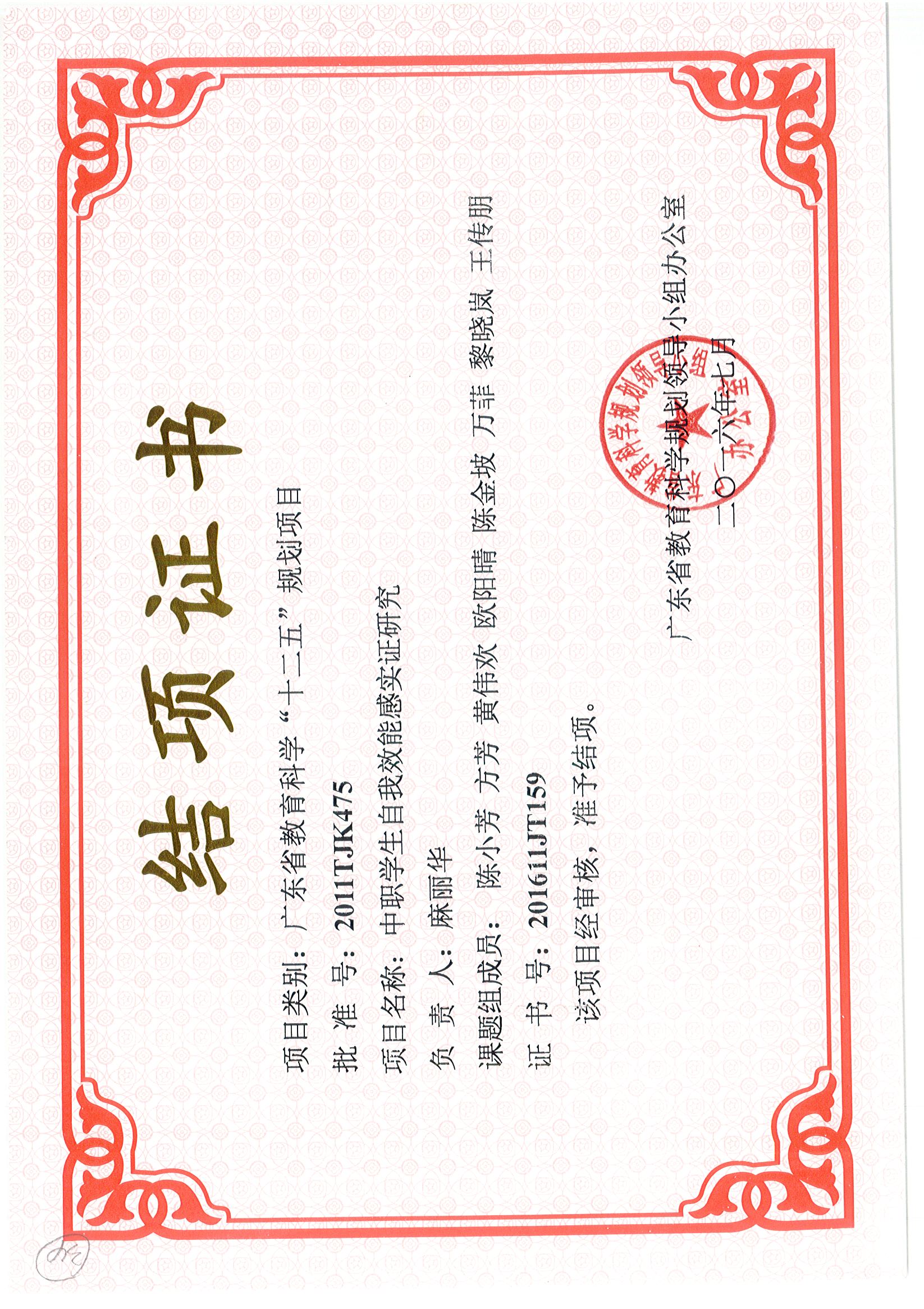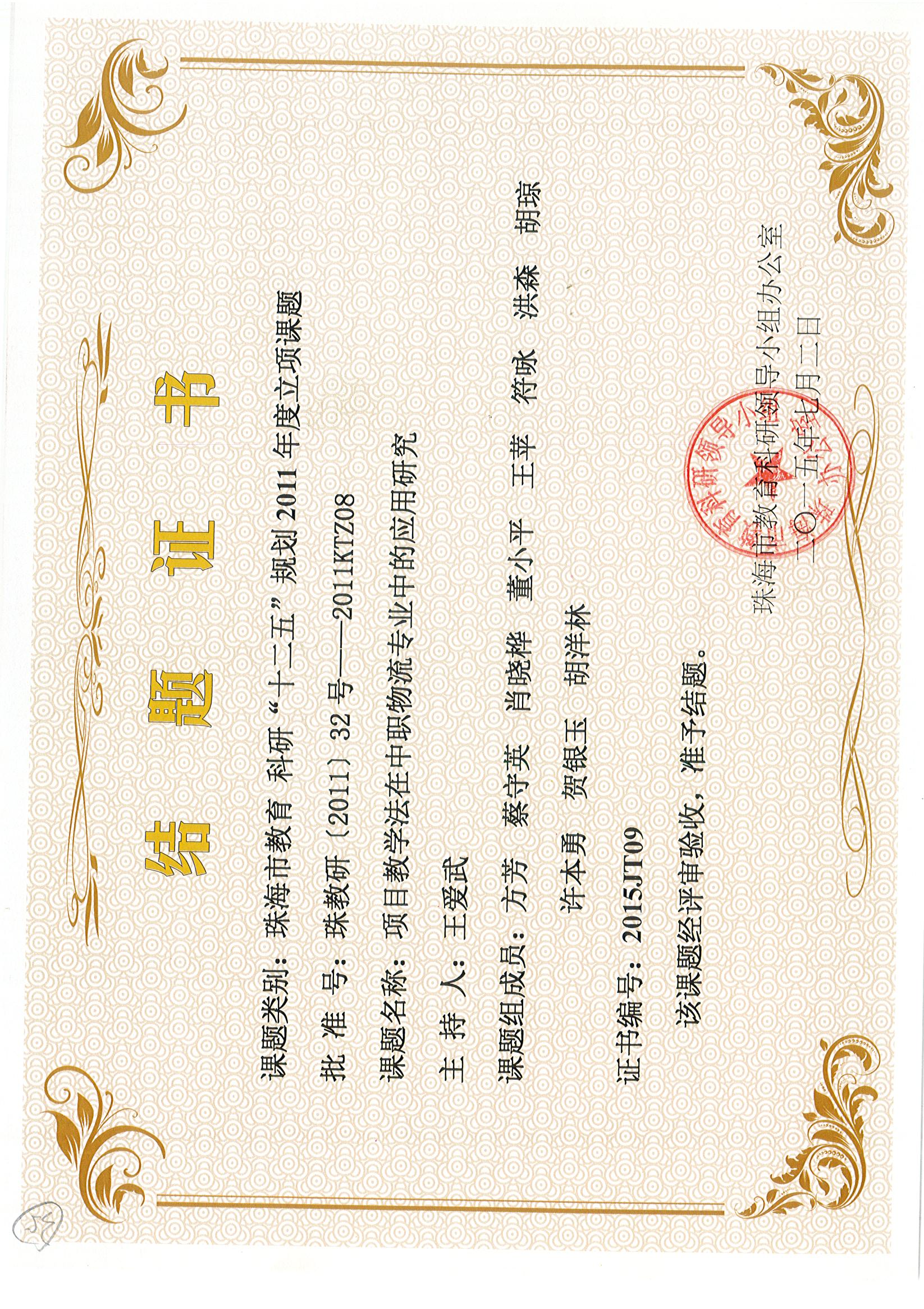 11 | 项目教学法在中职物流专业中的应用研究 | 10000 | 已结题 | 珠海市教育科研“十二五”规划2011年度立项课题 | 珠海市教育科研领导小组办公室 |
