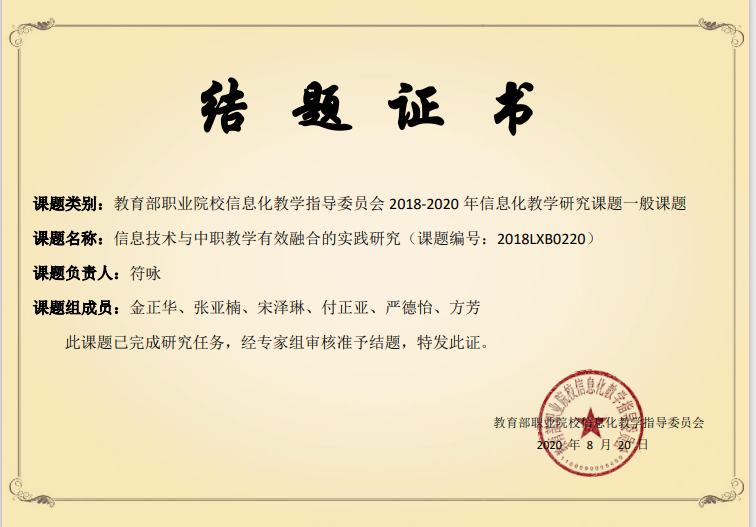 6 | 信息技术与中职教学有效融合的实践研究 | 0 | 已结题 | 2018-2020年信息化教学研究课题 | 教育部职业院校信息化教学指导委员会 |