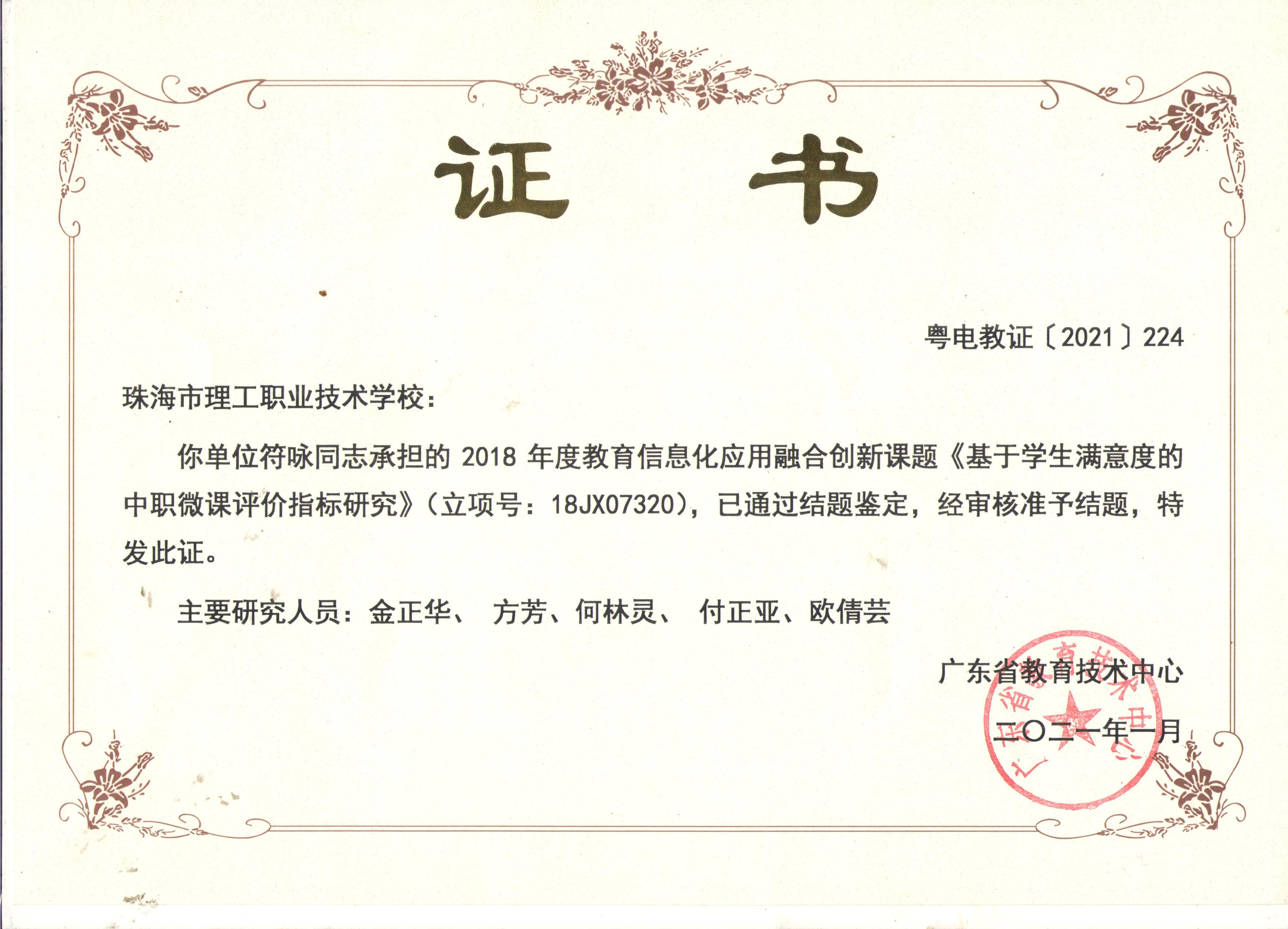 8 | 基于学生满意度的中职微课评价指标研究 | 0 | 已结题 | 广东省教育技术中心2018年度专项课题 | 广东省教育技术中心 |