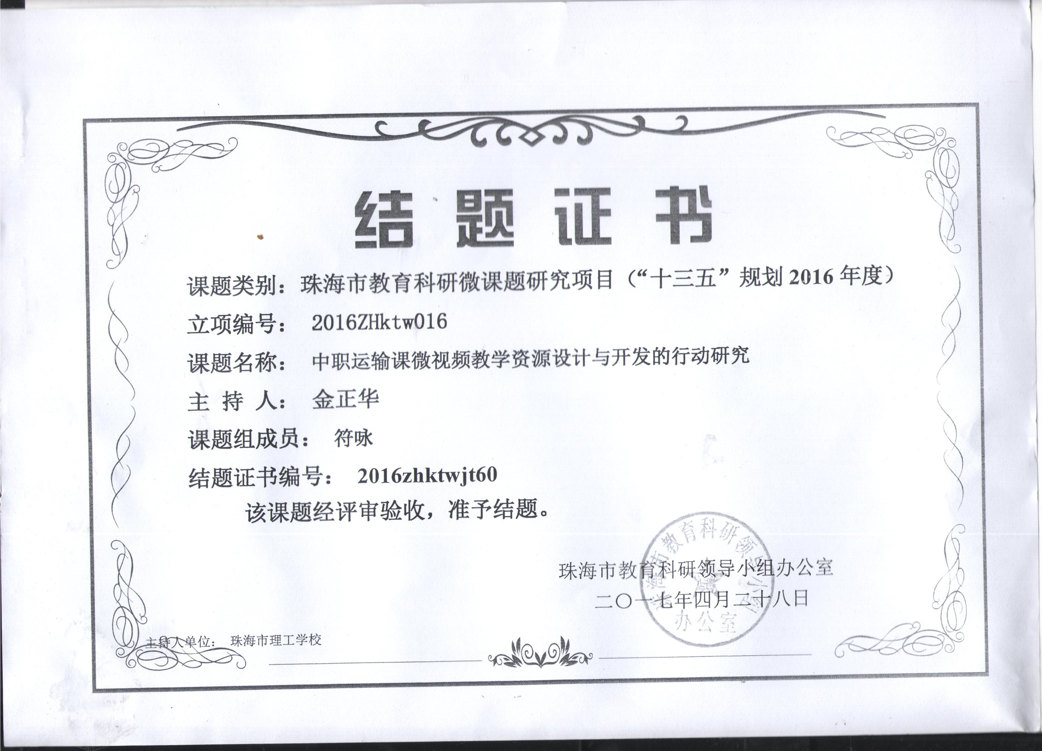 13 | 中职运输课微视频教学资源设计与开发的行动研究 | 0 | 已结题 | 珠海市教育科研微课题研究项目(2016年度) | 珠海市教育科研领导小组办公室 |