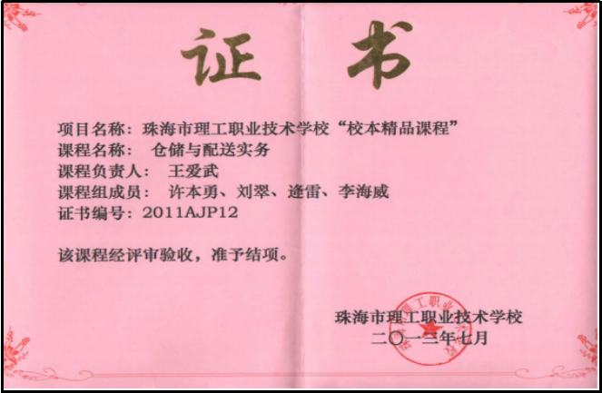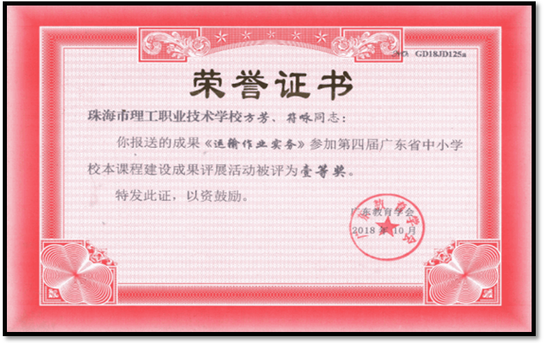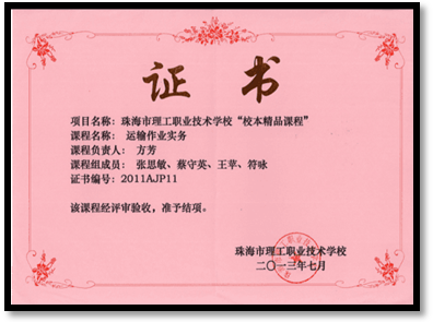 《运输作业实务》在第四届广东省中小学校本课程建设成果评选活动中被评为一等奖.