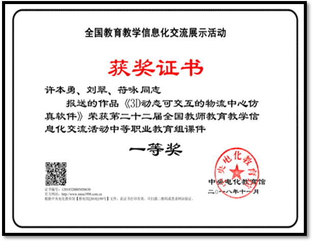 2018.11 | 课件:《3D动态可交互的物流中心仿真软件》 | 许本勇 刘翠 符咏 | 第二十二届全国教师教育教学信息化交流活动 | 省级一等奖 | 中央电化教育馆 |