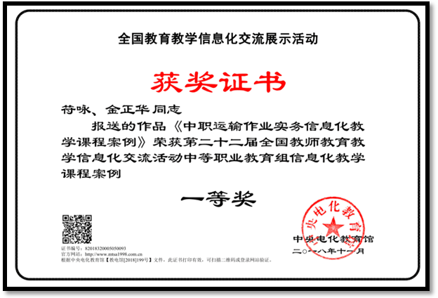 2018.11 | 信息化教学课程案例:《中职运输作业实务信息化教学课程案例》 | 符咏 金正华 | 第二十二届全国教师教育教学信息化交流活动 | 省级一等奖 | 中央电化教育馆 |