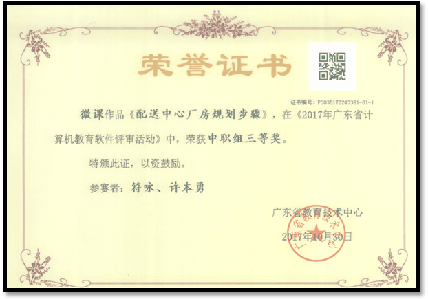 2017.10 | 微课:《配送中心厂房规划步骤》 | 符咏 许本勇 | 2017年广东省计算机教育软件评审活动 | 省级三等奖 | 广东省教育技术中心 |
