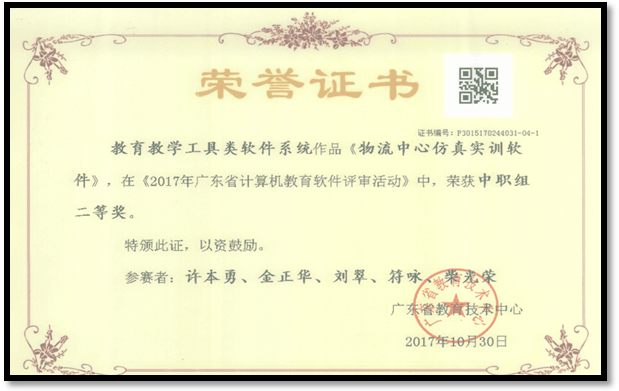 2017.10 | 教育教学工具类软件系统:《物流中心仿真实训软件》 | 许本勇 刘翠 金正华 符咏 柴光荣 | 2017年广东省计算机教育软件评审活动 | 省级二等奖 | 广东省教育技术中心 |