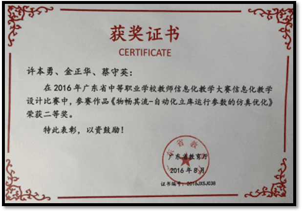 2016.9 | 许本勇、金正华、蔡守英 | 2016年广东省职业院校教师信息化教学大赛信息化教学设计 | 省级二等奖 | 广东省教育厅 |