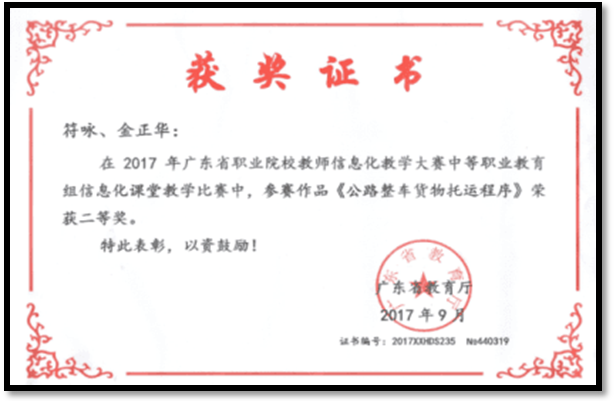 2017.9 | 符咏、金正华 | 2017年广东省职业院校教师信息化教学大赛信息化课堂教学比赛 | 省级二等奖 | 广东省教育厅 |