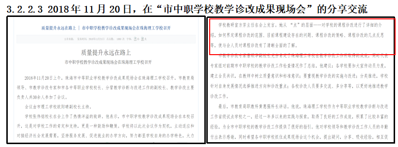 1 | 2018年11月,方芳老师在 “市中职学校教学诊改成果现场会”上,向市教育局领导、市教学诊改专家和市各中等职业学校校长、分管教学诊断与改进工作的副校长、教学诊改主要负责人介绍了“学校的课程诊改”的经验,受到高度肯定。 |
