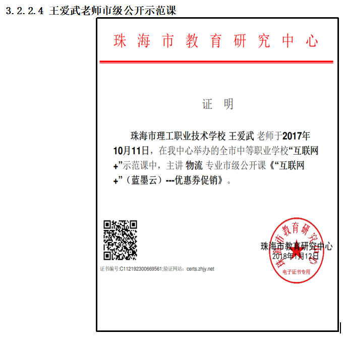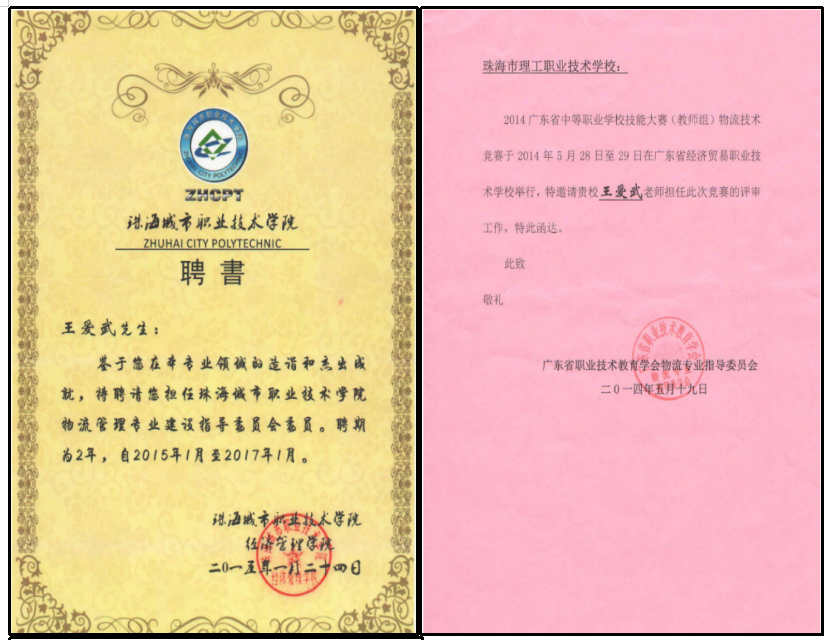 4 | 2015年1月,王爱武老师担任珠海城市职业技术学院物流管理专业建设指导委员会委员,聘期自2015年1月至2017年1月。 |