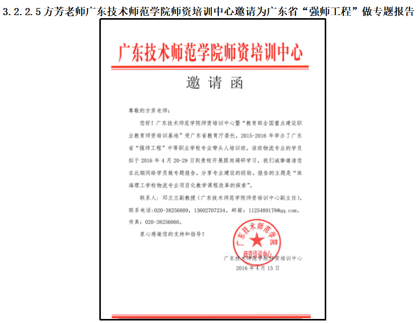 4 | 2016年4月,方芳老师受广东技术师范学院师资培训中心邀请,为“广东省强师工程”做专题报告,报告的主题“是珠海市理工职业技术学校物流专业项目化教学课程改革的探索”。 |