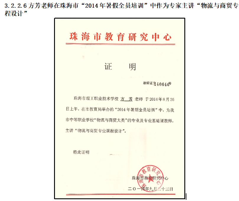 5 | 2014年8月,方芳老师受市教育研究中心委托,作为主讲教师对市商贸专业教师进行全员业务培训,主题为《物流与商贸专业课程设计》。 |