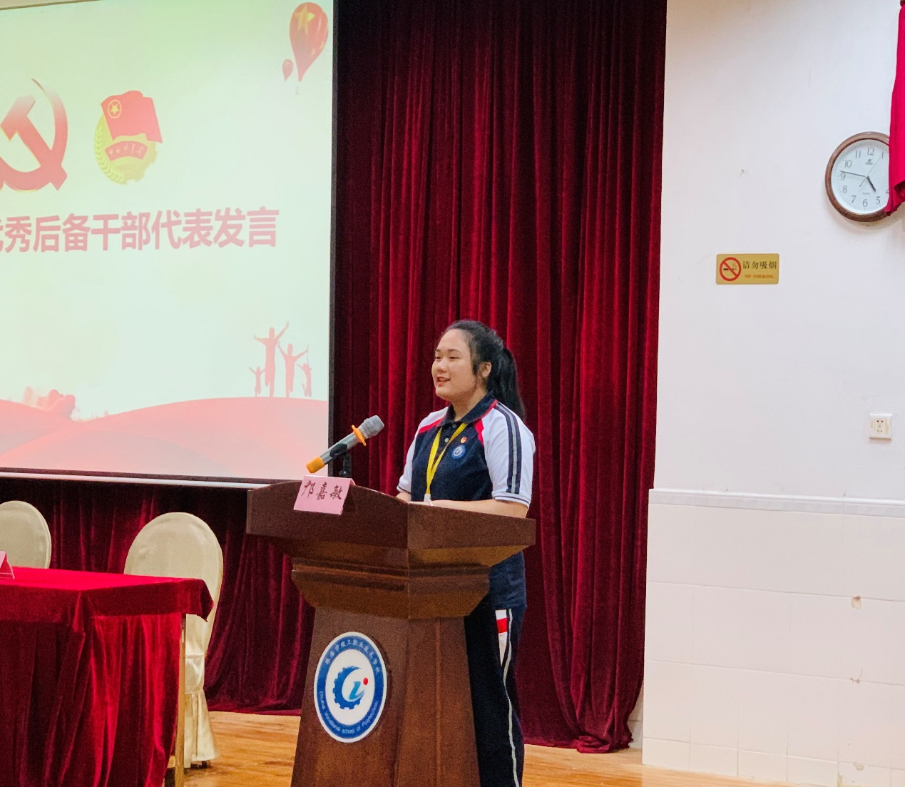 卢秋羽同学作为后备干部代表发言,她首先感谢学校给了她这次难得的机会参与干部培训班的学习,感谢老师们不辞辛劳传授知识。她表示自己在培训学习中收获颇丰,切身体会到了学生干部所肩负的责任和使命。