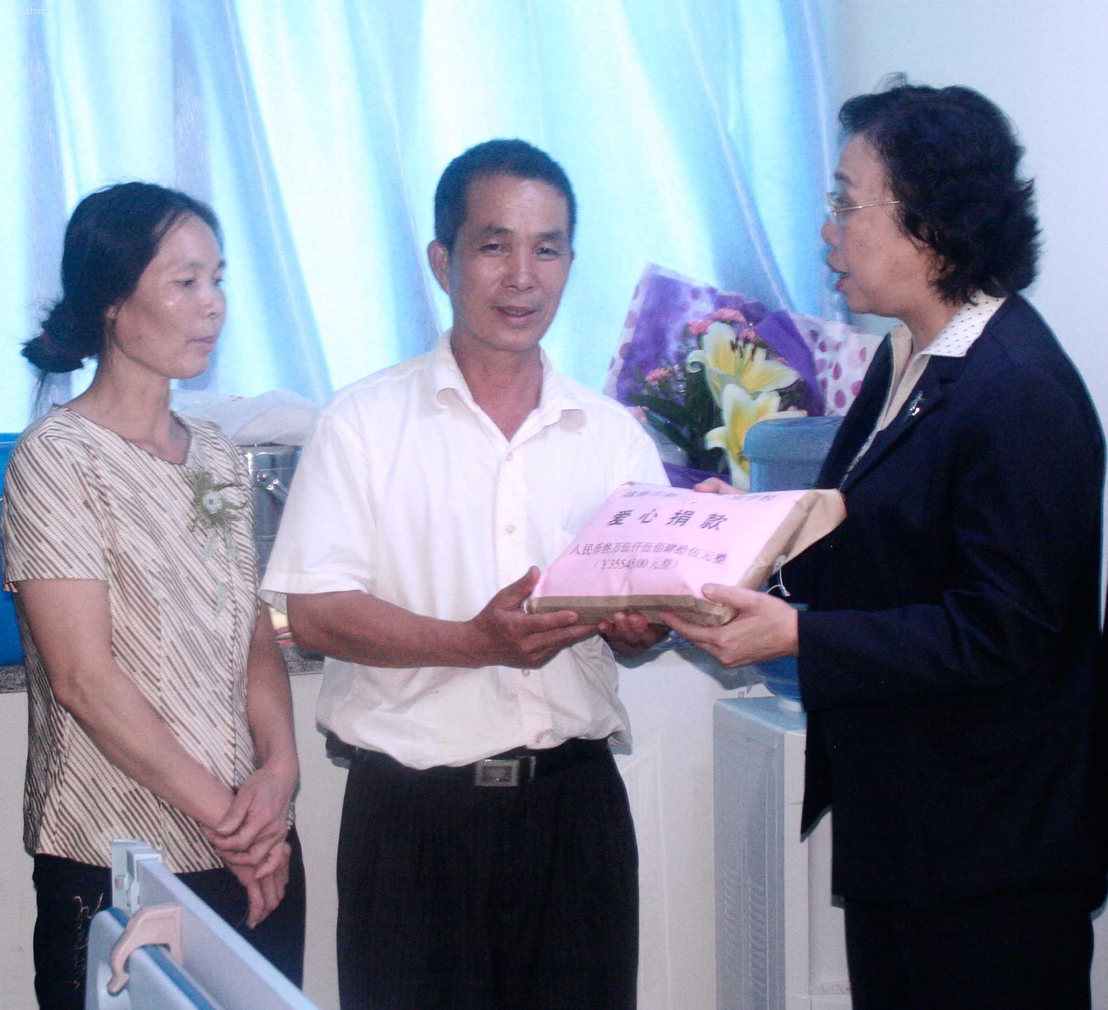 詹红红校长亲手将全校师生们的爱心捐款交到林清云同学父母手中