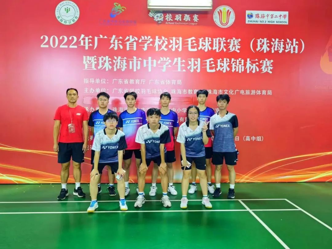 竞赛队从校羽毛球队中选拔出综合能力强、竞技状态优的优秀选手,赛前积极开展针对性专项特训。比赛日激烈角逐中,男子单打以小组第一出线,2:0挺进四强赛,2:1杀入决赛;决赛对阵珠海二中获得亚军。女子单打以小组第二出线直接晋级八强,2:1挺进四强赛,半决赛对阵珠海二中获得第四名。男子双打以小组第二名出线,2:0进入八强;四强赛中收获第八名。