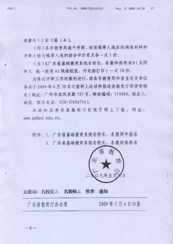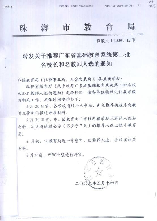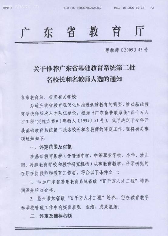 请各位老师认真阅读《转发关于推荐广东省基础教育系统第二批名校长和名教师人选的通知》,并于本周二(5月19号)下班前将自荐名单送办公室。