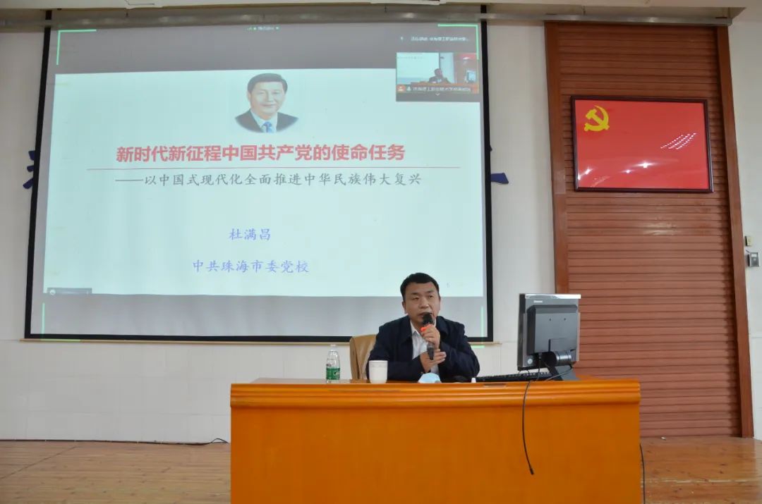 12月6日下午,我校邀请了中共珠海市委党校市情研究中心副教授,中共珠海市委宣讲团成员杜满昌法学博士,两校区通过视频连线的方式,进行党的二十大精神进校园的宣讲。会议由学校党委委员、副校长黄武略同志主持,学校全体教职工参加了本次宣讲活动。