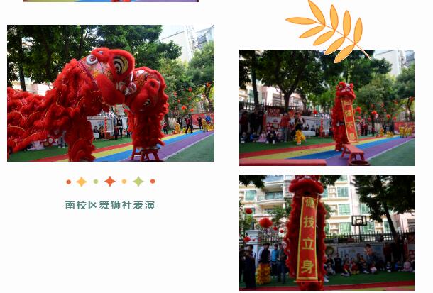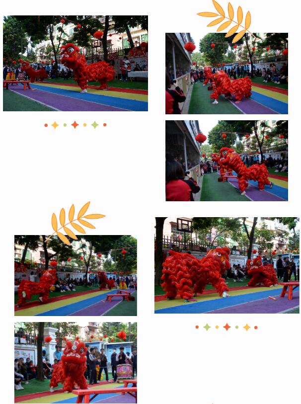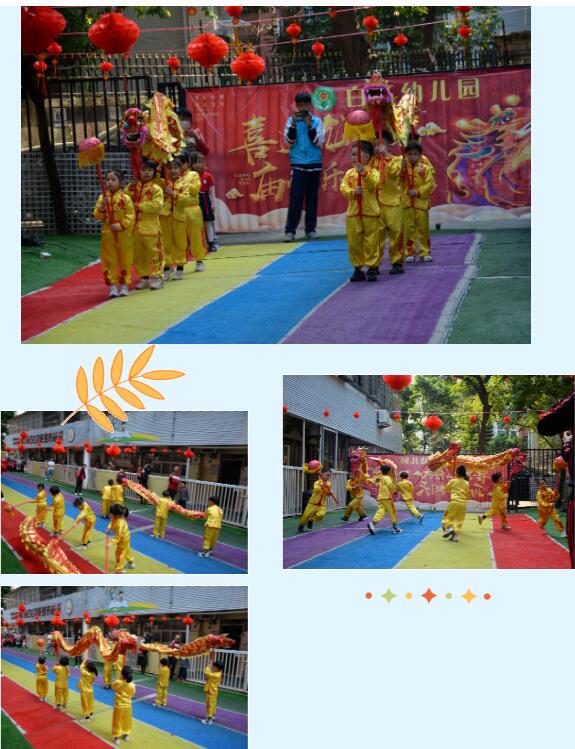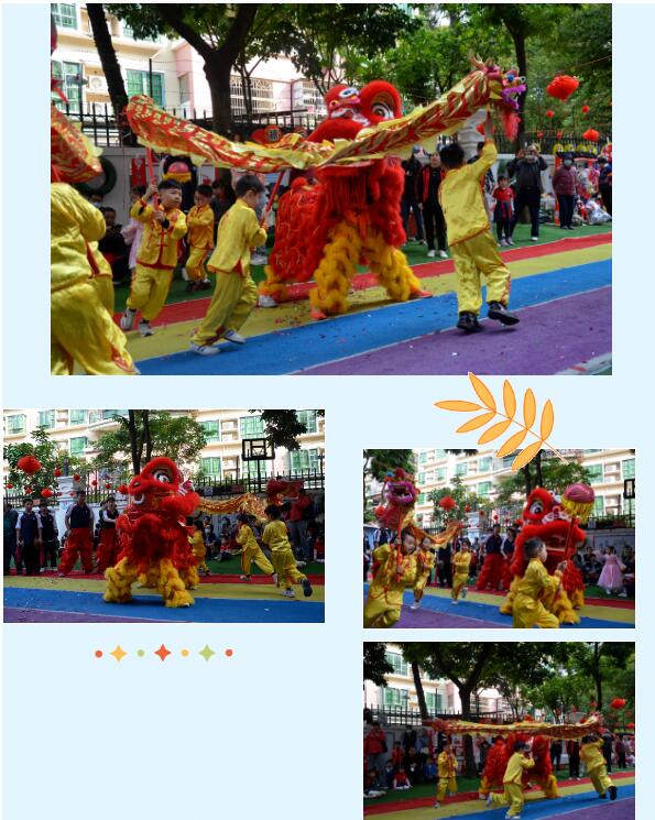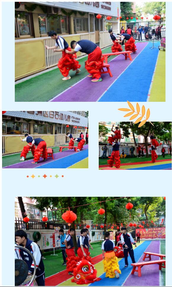 演出开始,先上场表演是白石幼儿园的舞龙团队的小朋友,他们举着金龙,步伐有力。接下来,南校区醒狮队进行表演,铿锵有力、热闹非凡的锣鼓阵阵响起,两只活灵活现的狮子在幼儿园翻腾起舞,紧跟锣鼓的节奏,踩着步点和位置,配合默契,完成一个又一个精彩绝伦的动作。