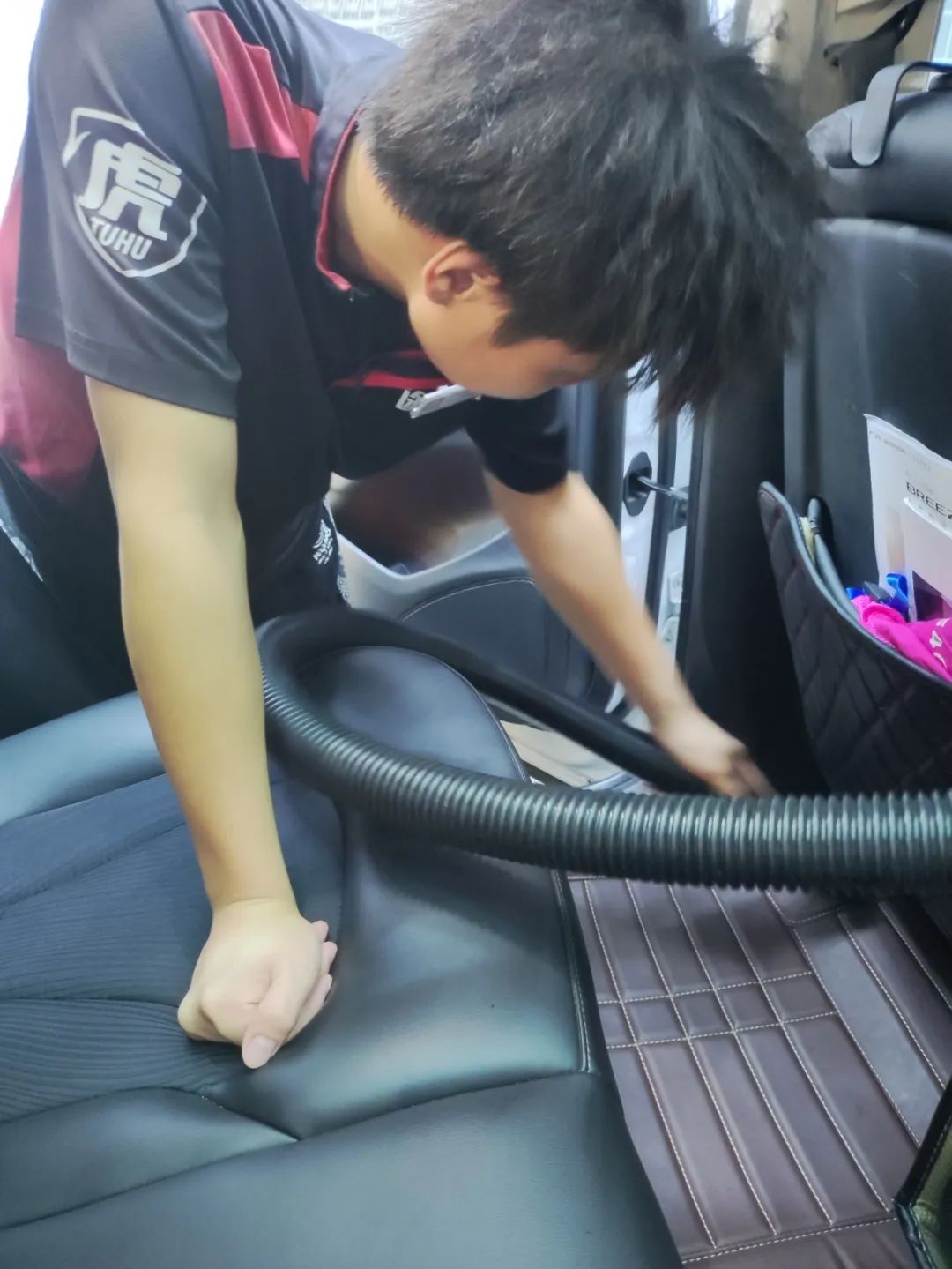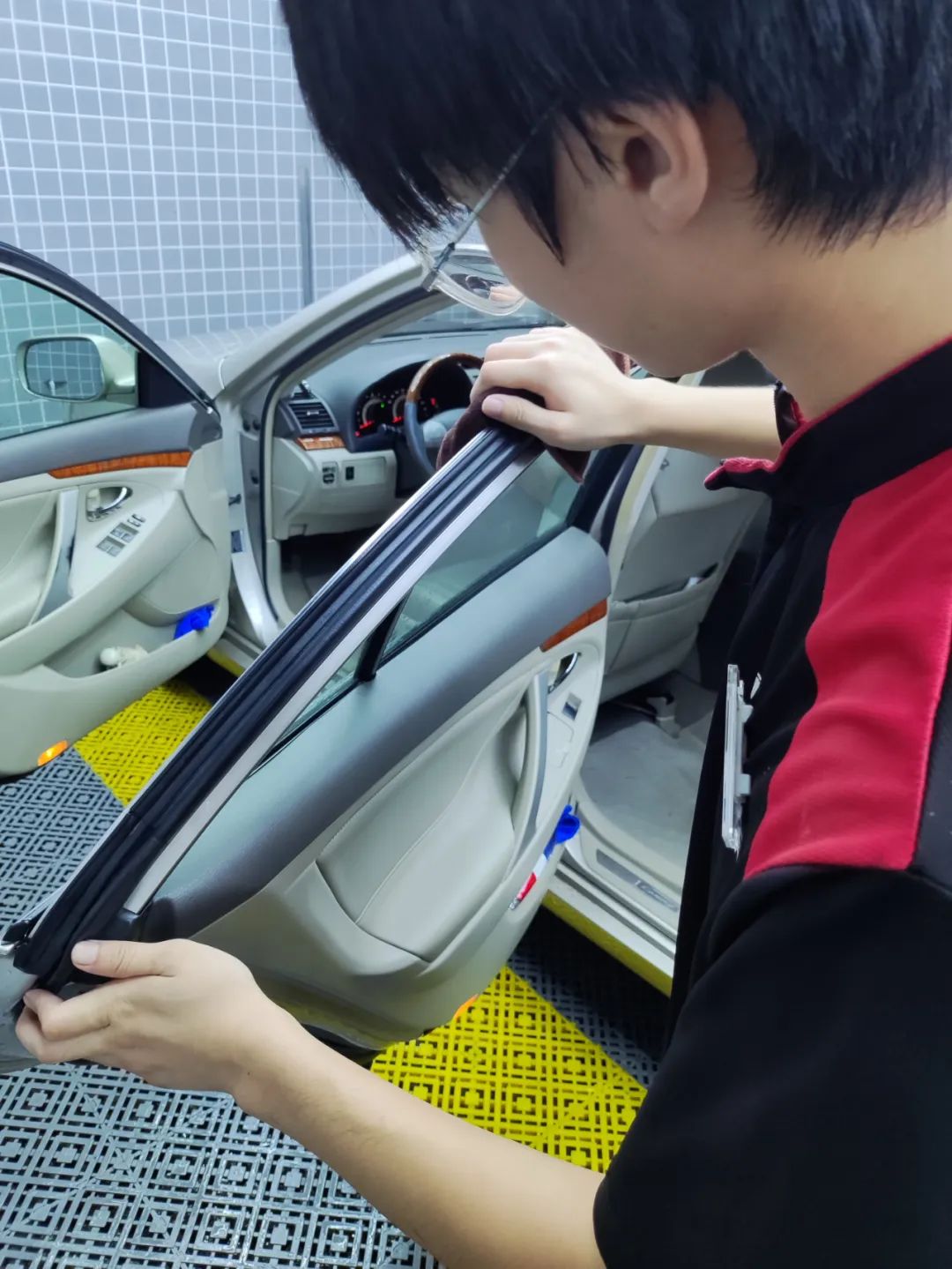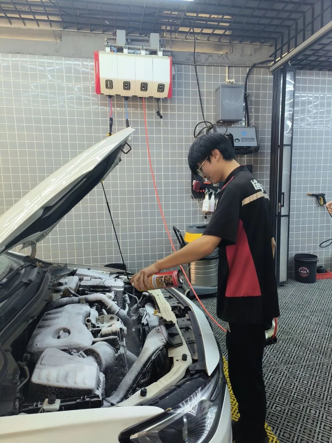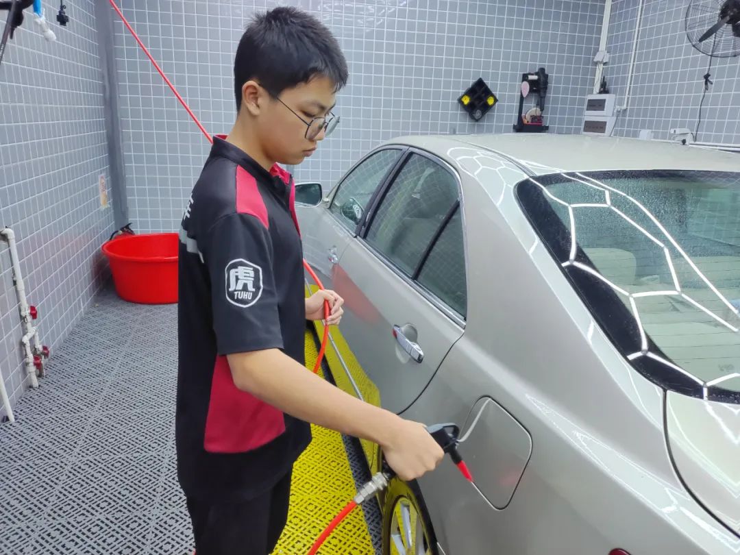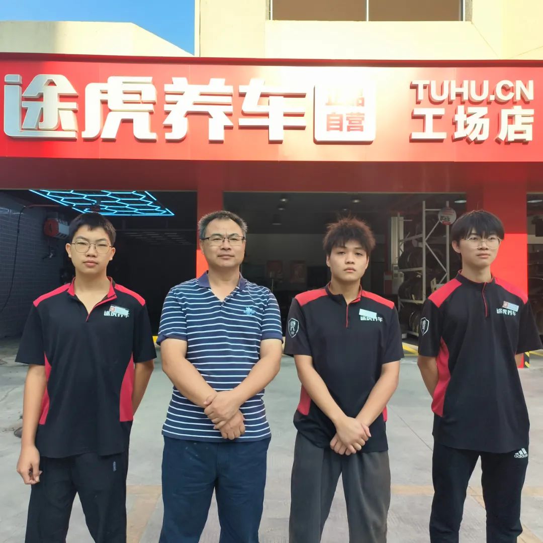 20汽3班的刘彦志(左一)、沈修平(左三)、林志豪(左四)3位同学,自2022年9月1日开始,在珠海市香洲区湾仔镇途虎养车工场店南湾南湾路店美容部实习,实习的具体内容包括自主完成完整的洗车流程、使用简单的维修工具、能够完成简单的维修任务。