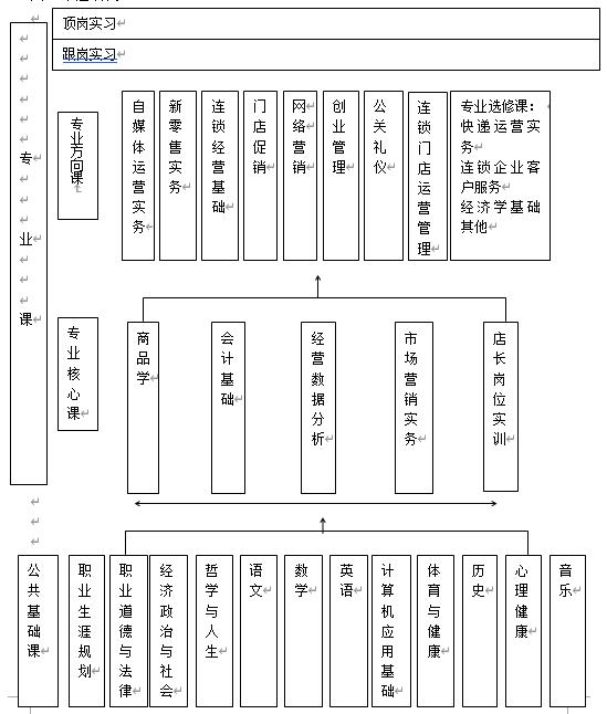 2 | 连锁企业经营门店运营管理 | 了解连锁门店营运的基本业务;掌握连锁门店主要岗位的作业流程;能进行卖场布局和商品陈列、理货、进存货、收银、促销活动、顾客投诉处理和顾客关系管理、防损和安全管理等。 | 72 | 4 |