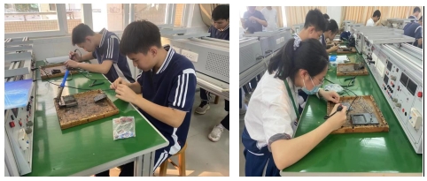 该课程由斗门校区电气技术专业部朱海艺、周林、冯明新、邝华辉老师组成的教师团队完成教学设计与实施,通过选取“声控流水灯”电路的安装与调试作为劳动项目,培养学生动手能力和创新思维。课堂上,同学们化身为小小工程师,沉浸于科技的魅力世界,在互动体验中深入理解电子科学原理,享受到了知识探索的乐趣和精益求精的工匠精神重要性。
