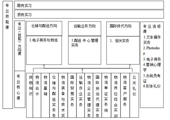 校内实训实习必须按学校开设的专业方向,具备仓储与配送方向、运输业务方向、国际货代方向和快递业务方向的基础作业能力实训室,物流综合实训室和创业孵化室。