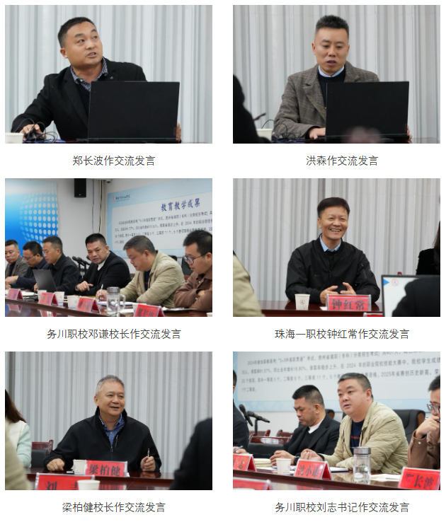 随后,双方在党员活动室召开座谈交流会。我校支教教师郑长波、洪森先后分享驻校教学经验,从课程设计、实训指导等维度为务川职校教师提供实操建议;邓谦校长详细汇报“组团式”帮扶成效,介绍学校在教学质量提升、师资培训等方面的进展。钟红常书记表示将从名班主任工作室、信息化管理、专业建设方面共享资源,助力务川职校发展。梁柏健校长在发言中肯定务川职校的发展成果,并明确新三年结对帮扶将围绕“四个优先”推进,秉持“着眼未来,做好规划,由小到大,由大到强,由强到精”的发展思路,通过做好存量、谋划增量、拓展资源、打造品牌,持续深化资源共享与合作。刘志书记代表务川职校致谢,表示将珍惜合作机会,推动教育教学质量再上新台阶。
