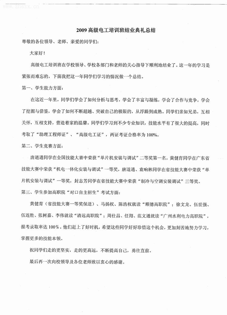 09高级电工2班共有21名学员,其中11名同学分别考取了广东省水利电力技术学院、顺德职业技术学院等高职院;有1名同学在2010全国职业院校技能大赛上荣获单片机竞赛项目的二等奖,有4名学生在2010广东省中职学校技能大赛中分别取得机电安装、单片机和制冷设备三个项目的3个一等奖和1个三等奖的好成绩。此次全班同学都顺利取得了电子助理工程师和高级电工证书,10名走向工作岗位的同学分别被希格玛(珠海)电气有限公司录用。