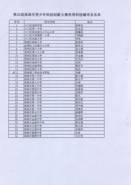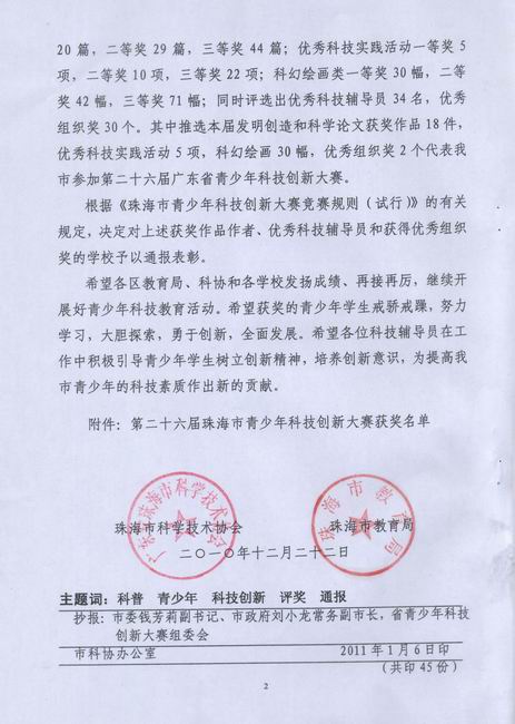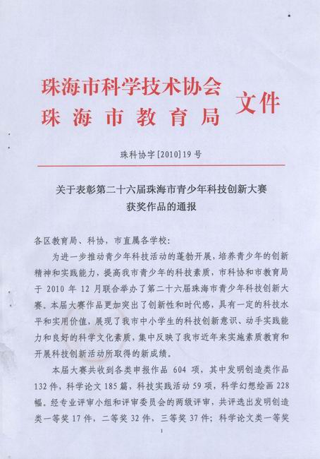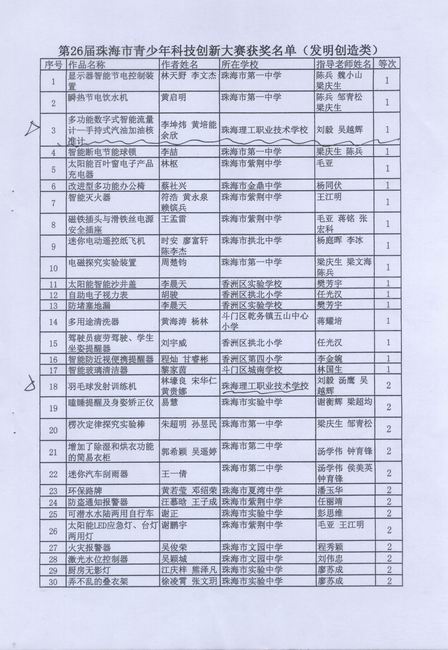 关于表彰第二十六届珠海市青少年科技创新大赛获奖作品的通报