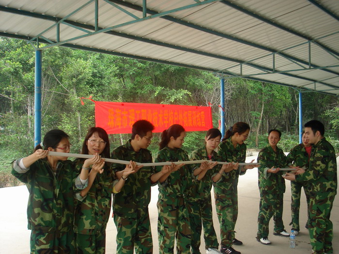 8日中午,我们到达了南海大湿地公园拓展基地,随着“破冰”活动的顺利进行,珠海理工学校户外拓展训练拉开了序幕。全体学员聆听了基地教练对相关情况的简要说明和对此次活动的期望后,我们就开始了训练前的热身。按教练的要求分小组,各小组成员集思广益确定了队长、队名、口号和队歌,通过小组风采展示的方式进行PK,最终确定了“神马队”和“给力队”。