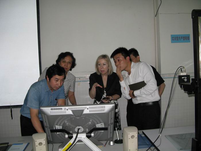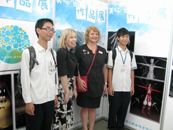 2011年5月27日,新西兰国立理工联合学院院长Julia Pedley(左二)、系主任Jodie Palmer(左三)来我校考察,与2011暑期去该学院作交流生的二位09级动画专业学生在学生作品前合影。
