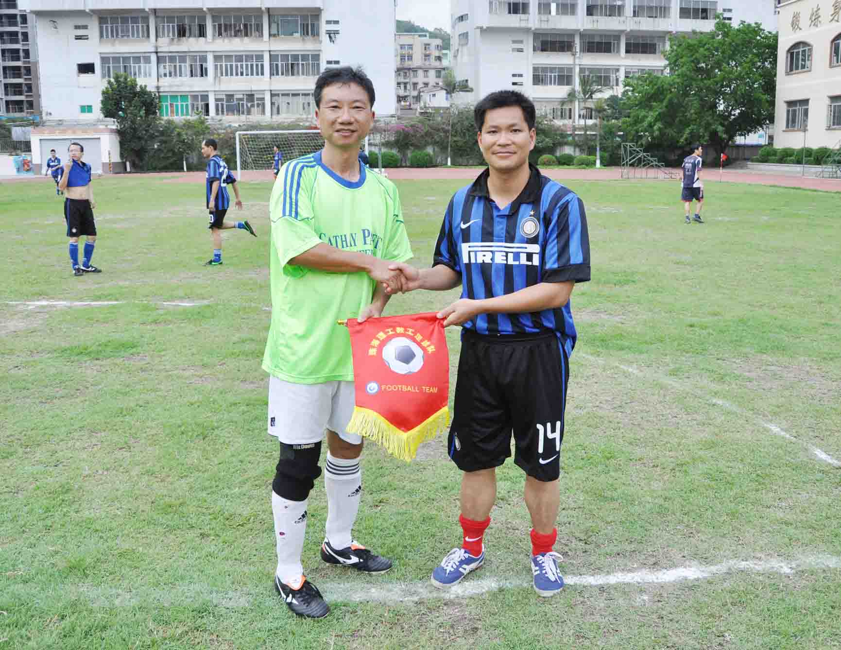 梁明亮老师代表教工足球队向香港国泰足球队赠送队旗