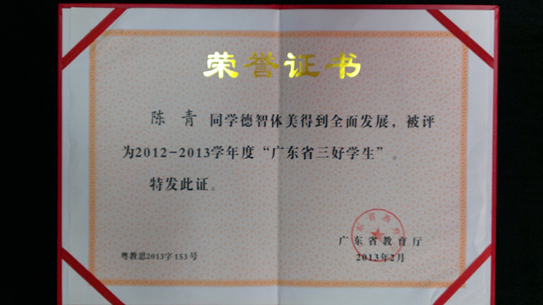 我校陈青同学获评2012-2013学年度“广东省三好学生”