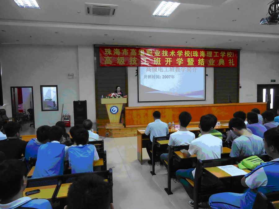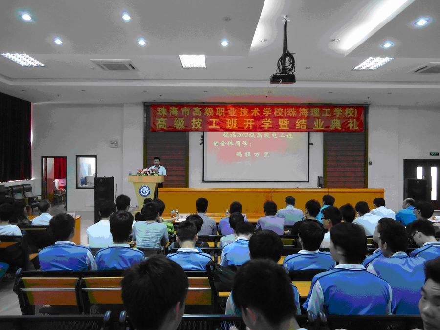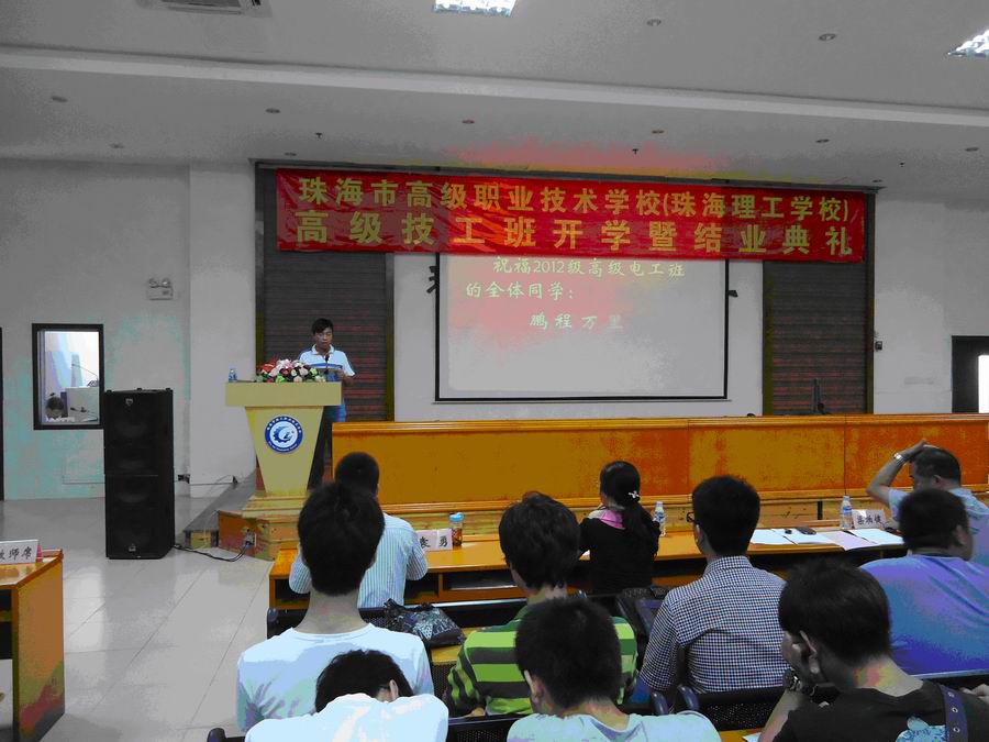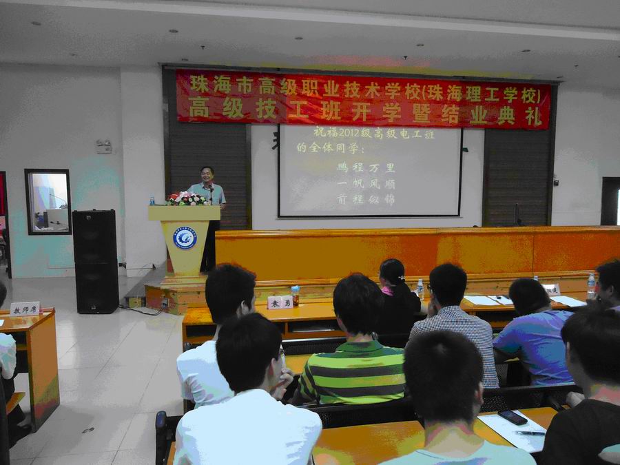 紧接着梁柏健校长发言,他说从第一届高级电工班开学开始,就标志着我校的办学水平、办学质量上了一个新台阶,同时也是我校职业教育旅程上的又一个新起点。在这6年历程中,我们输送了一大批优秀的技能人才,得到了社会、企业、同行的高度赞赏,为珠海市的高技能人才做出了贡献。他希望12级毕业的同学能用所学的知识与技能更好地为社会、为企业服务,自食其力,回报政府、回报父母,为母校增光;也希望13级高级工班的同学,向他们学习,自强不息、刻苦钻研,完成学业。