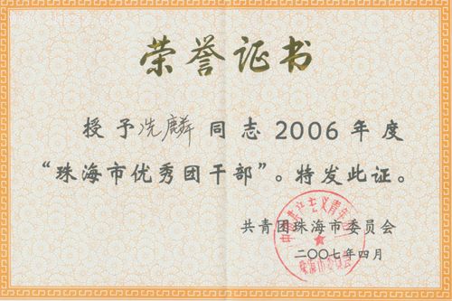 珠海市团委在庆祝中国共产主义青年团成立八十五周年之际对2006年度在团工作表现积极,做出成绩的先进集体、先进个人进行表彰。我校05物流1团支部、冼麟等12位团员受到团市委表彰。
