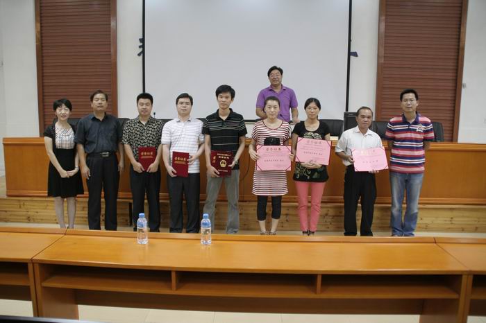 在学校颁奖仪式上,校领导为获奖教师们颁奖