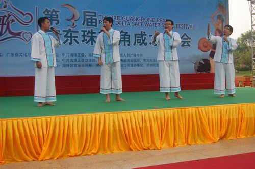 咸水歌是珠三角地区特有的一种以广州方言演唱的民歌,富有浓郁的岭南水乡特色。本届咸水歌会展演项目包括原生态以及结合现代流行音乐创编具有浓郁岭南特色的创编歌曲两部分。珠海市理工职业技术学校由黄华欢书记